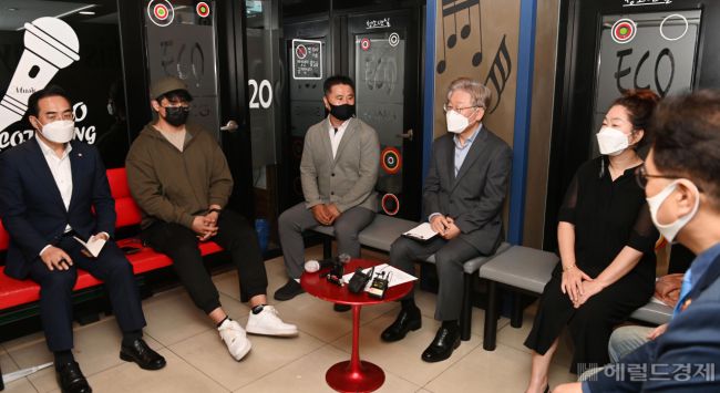 [사진=국회사진기자단] 더불어민주당 대선주자인 이재명 (오른쪽 세번째)경기도지사가 7일 오전 서울 종로구의 한 코인노래방에서 '코로나19 위기 업종 자영업자 현장 간담회'를 갖고 자영업자의 고충을 듣고 있다. babtong@heraldcorp.com Copyright ⓒ 헤럴드경제 All Rights Reserved.