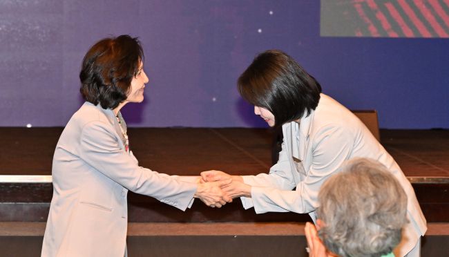 김문수 국민의힘 대선 후보 부인 설난영 씨(왼쪽)와 이재명 더불어민주당 대선 후보 부인 김혜경 씨가 12일 오후 서울 중구 신라호텔에서 열린 조계종 중앙신도회 창립 70주년 기념식에서 손을 맞잡고 있다.