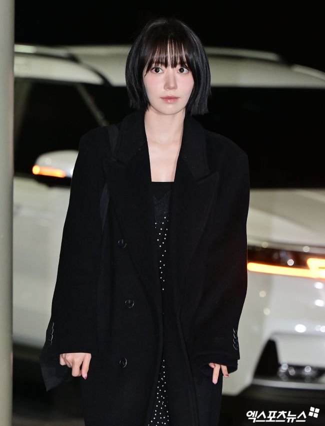 그룹 르세라핌 사쿠라와 홍은채가 해외일정 차 13일 오후 김포국제공항을 통해 일본으로 출국했다. 출국 전 포즈 취하는 르세라핌 사쿠라. 김한준 기자 kowel@xportsnews.com