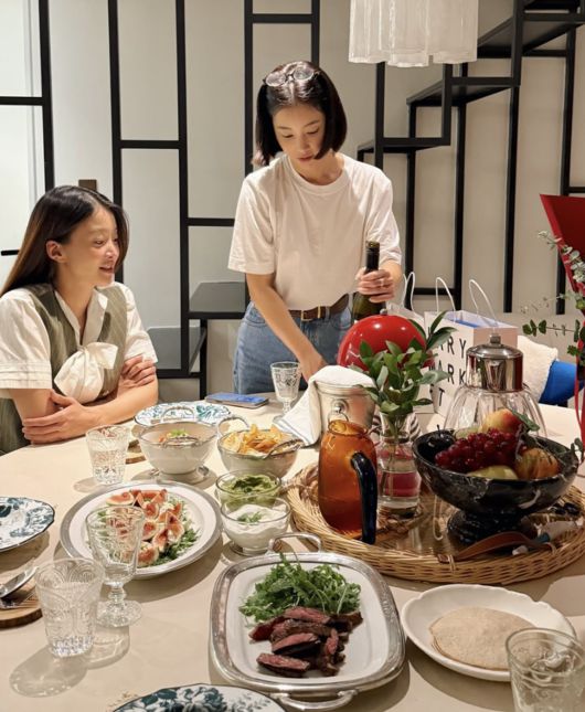 배우 기은세가 출산을 앞둔 절친 배우 이시영을 위해 정성 가득한 홈 디너를 준비했다. 기은세는 4일 자신의 인스타그램에 “후다닥 정신없이 차렸지만 즐겁고 맛있었던 우리의 저녁”이라는 글과 함께 여러 장의 사진을 게재했다. 사진 속 기은세는 집에서 직접 요리를 차려 이시영 등 지인들과 함께 식사를 즐기고 있다. 정갈하게 차려진 식탁 위에는 무화과 샐러드, 스