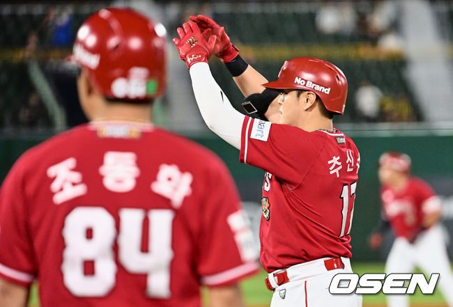 SSG 랜더스 추신수가 연장 10회초 1사 1,2루 1타점 좌전 안타를 치고 세리머니를 하고 있다. 2023.08.05 / foto0307@osen.co.kr SSG 랜더스 추신수가 연장 10회초 1사 1,2루 1타점 좌전 안타를 치고 있다. 2023.08.05 / foto0307@osen.co.kr "앞으로 더 많이 할 것 같다. 앞으로 더 좋아질 일만