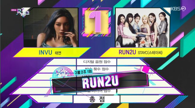 스테이씨가 2주 연속 1위의 영광을 안았다. 11일 방송된 KBS 2TV '뮤직뱅크' 3월 둘째 주는 태연 'INVU'와 스테이씨 'RUN2U'가 1위 후보에 올랐다. 이날 1위는 스테이씨 'RUN2U' 였다. 스테이씨는 지난 주에 이어 2주 연속 1위를 차지하는 쾌거를 거뒀다. 그러나 멤버 윤이 당일 코로나19 확진 판정을 받아 방송에는 출연하지 않았다.