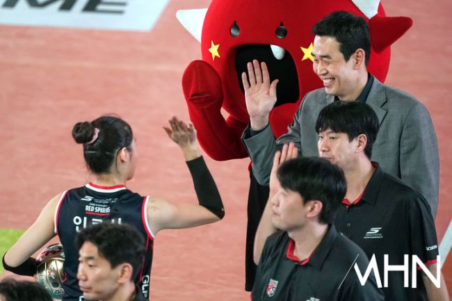 19일 대전충무실내체육관에서 '2025-2026 V-리그 여자부' 정관장 대 GS칼텍스 경기가 열렸다. 이날 정관장의 새로운 아시아 쿼터 선수 몽골 출신 아웃사이드 히터 자미얀푸렙 엥흐서열(등록명 인쿠시)가 새로운 무대 데뷔전을 펼쳤다. 고희진 감독이 인피시를 보며 환한 미소를 짓고 있다.