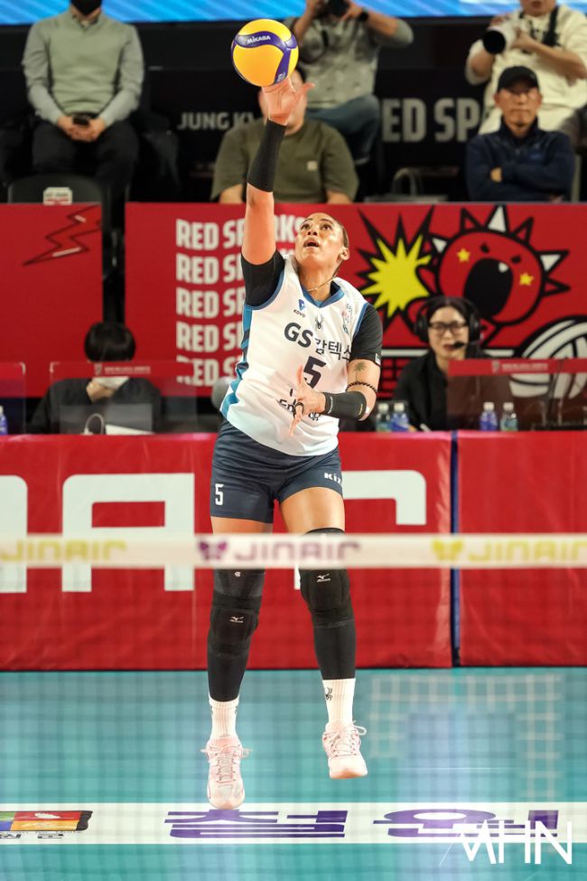 19일 대전충무실내체육관에서 '2025-2026 V-리그 여자부' 정관장 대 GS칼텍스 경기가 열렸다. 이날 정관장의 새로운 아시아 쿼터 선수 몽골 출신 아웃사이드 히터 자미얀푸렙 엥흐서열(등록명 인쿠시)가 새로운 무대 데뷔전을 펼쳤다. 실바가 경기를 펼치고 있다.