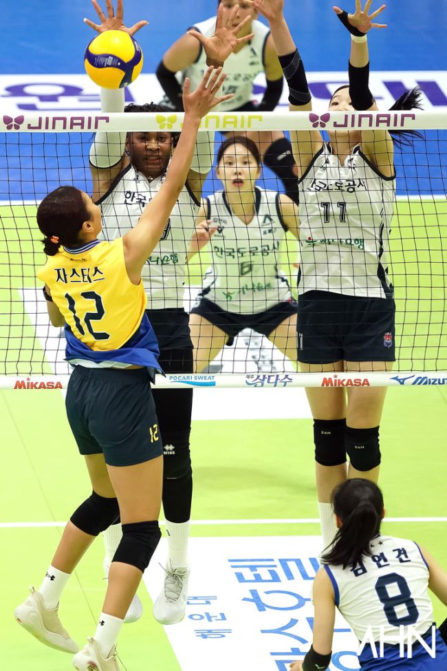 24일 경기도 수원실내체육관에서 '진에어 2025~2026 V-리그' 여자부 6라운드 현대건설(2위 56점 19승 11패)과 한국도로공사(1위 59점 21승 9패) 경기가 열렸다. 3연패에 빠진 한국도로공사가 부진한 틈을 타 현대건설은 4연승을 질주하며 맹추격하고 있다. 자스티스가 경기를 펼치고 있다.
