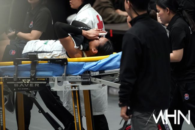 24일 경기도 수원실내체육관에서 '진에어 2025~2026 V-리그' 여자부 6라운드 현대건설(2위 56점 19승 11패)과 한국도로공사(1위 59점 21승 9패) 경기가 열렸다. 3연패에 빠진 한국도로공사가 부진한 틈을 타 현대건설은 4연승을 질주하며 맹추격하고 있다. 타나차가 부상으로 응급처치 위해 밖으로 이동하고 있다.