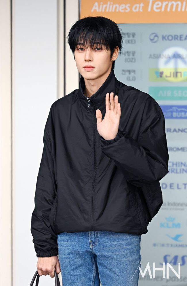 그룹 에이티즈(ATEEZ) 우영이 24일 오전 해외패션쇼 참석을 위해 인천국제공항을 통해 이탈리아 밀라노로 출국했다. 에이티즈 우영이 출국 전 포즈를 취하고 있다.