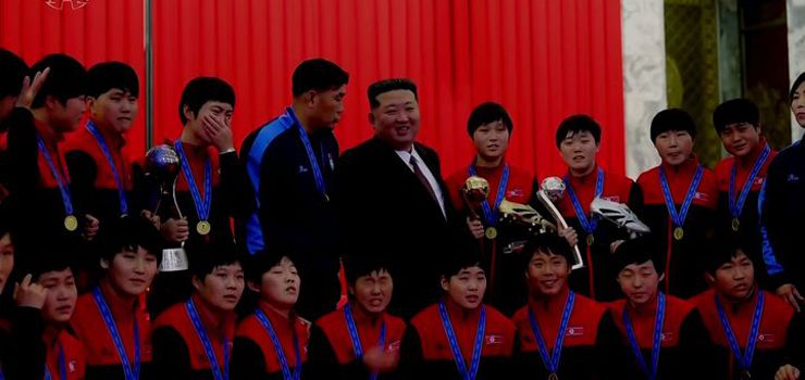 U-17 월드컵 우승한 여자 대표팀과 기념촬영 하는 김정은