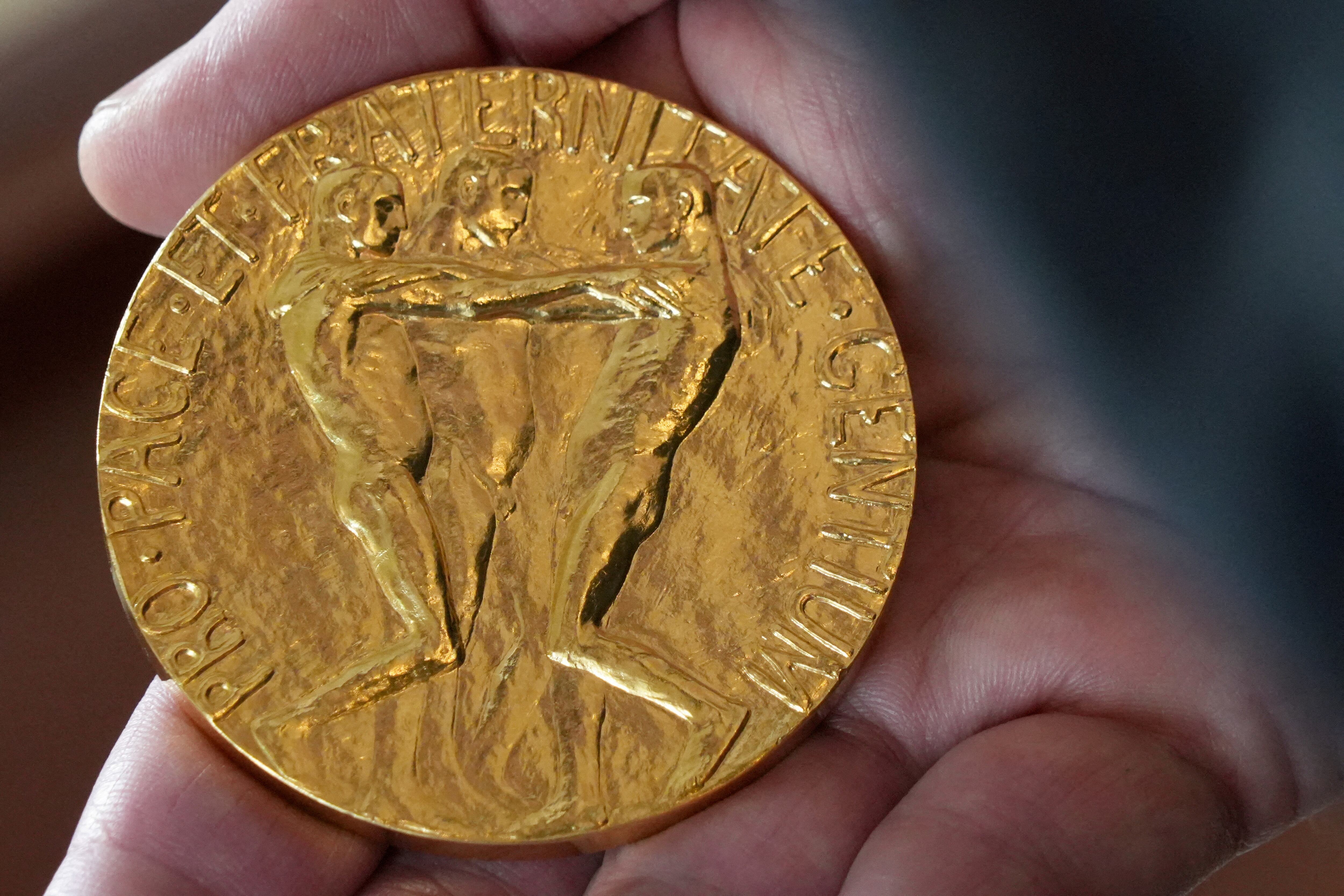 노르웨이노벨위원회의 한 직원이 손에 들고 있는 노벨평화상 메달 복제품/로이터 연합뉴스 |