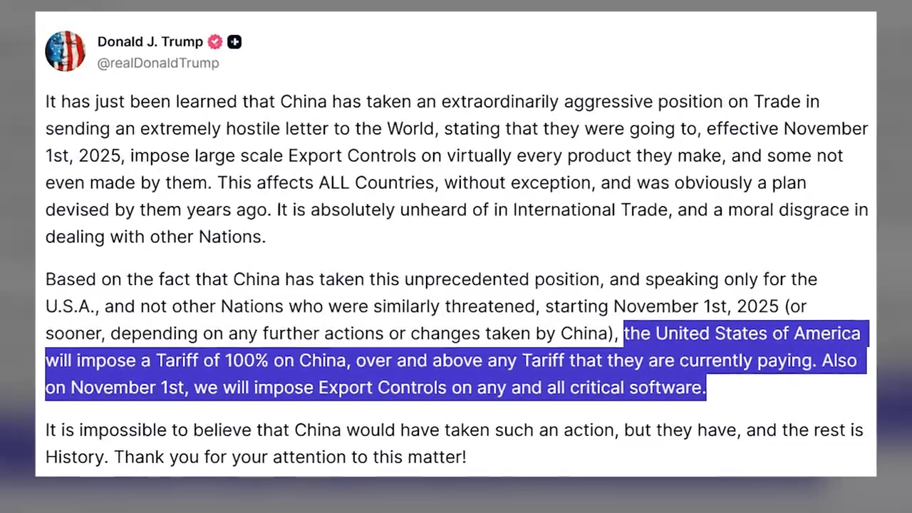 현지시간 10일 트럼프 대통령은 자신의 SNS를 통해 "중국이 2025년 11월 1일부터 사실상 모든 제품에 대해 전 세계를 대상으로 대규모 수출 통제를 시행하겠다는 서한을 보냈다"며 이같이 밝혔습니다.
