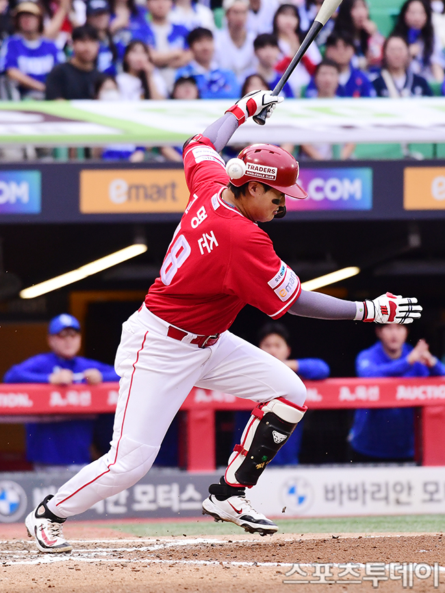 [인천=스포츠투데이 권광일 기자] 2025 신한은행 SOL Bank KBO리그 포스트시즌 준플레이오프 2차전 삼성 라이온즈와 SSG 랜더스의 경기가 11일 인천SSG 랜더스필드에서 열렸다. SSG 고명준이 6회말 타석에서 타격한 공이 몸에 맞아 아웃되고 있다. 2025.10.11.