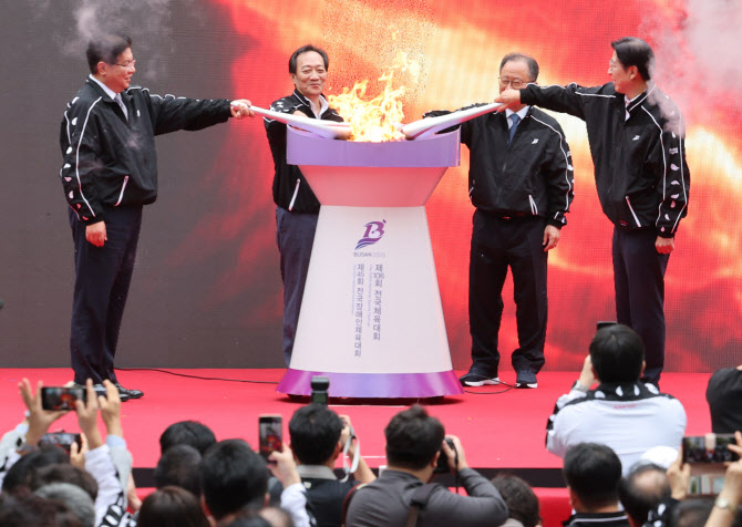 13일 오전 부산 연제구 시청 시민광장에서 열린 제106회 전국체육대회와 제45회 전국장애인체육대회 성화 합화 및 출발식 행사에서 박형준 부산시장(맨 오른쪽)과 안성민 시의회 의장, 김석준 시 교육감, 장인화 시 체육회장이 4곳에서 채화된 불꽃을 합화하고 있다. 사진=연합뉴스 |