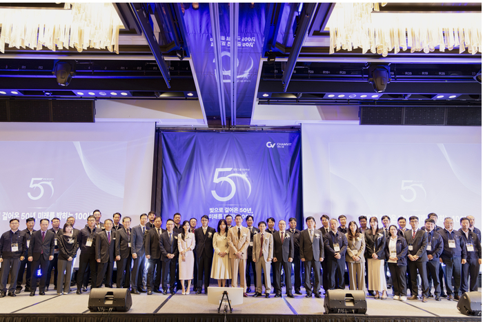 참빛그룹 임직원들이 16일 서울 포시즌스호텔에서 열린 창립 50주년 기념식에서 기념촬영을 하고 있다. 참빛그룹 제공 |