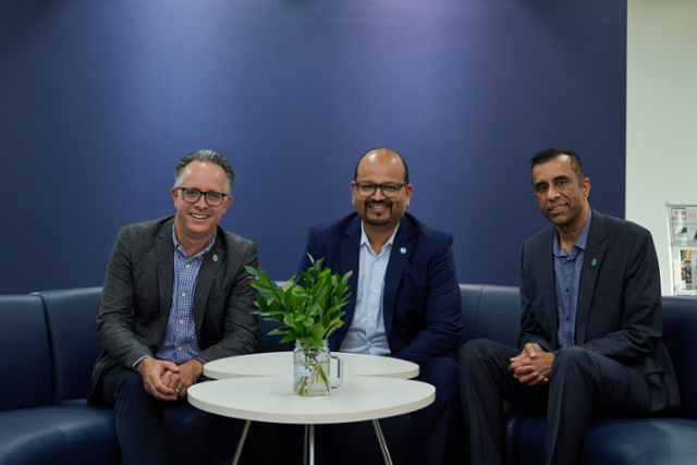 스카일로의 비제이 크리슈난(오른쪽부터) 부사장이 하만 인터내셔널의 슈만 세라 부사장, 피트 살라디노 스카일로 해외마케팅 총괄과 함께 서울 용산의 트윈시티남산 건물에서 인터뷰를 하며 스카일로 국내 서비스에 대해 설명하고 있다. 스카일로 제공 |