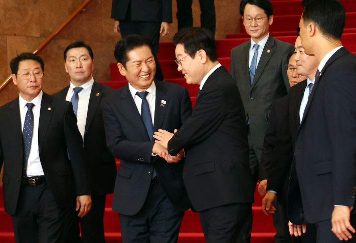 이재명 대통령이 4일 서울 여의도 국회에서 내년도 정부 예산안에 대한 시정연설을 마친 뒤 본회의장에서 나와 더불어민주당 정청래 대표와 악수하고 있다. 연합뉴스 |