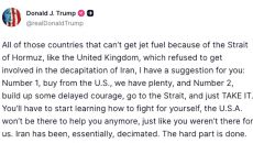 트럼프, 유럽동맹 맹비난 "호르무즈에서 석유 직접 확보하라"
