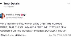 도널드 트럼프 미국 대통령은 현지시간 3일 "시간이 조금 더 주어지면 우리가 호르무즈 해협을 쉽게 개방하고, 석유를 차지해 큰- 2026.04.03 23:55