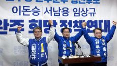 (전주=연합뉴스) 임채두 기자 = 더불어민주당 소속 이돈승·서남용·임상규 완주군수 예비후보는 6일 "우리는 경쟁만 하는 정치를- 2026.04.06 11:28