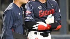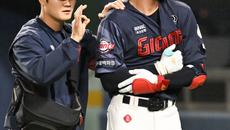 16일 잠실구장에서 열린 LG와 롯데의 경기. 롯데 윤동희가 투구에 맞은 뒤 통증을 호소하고 있다. 잠실=박재만 기자 pjm@- 2026-04-16 20:08