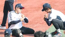 [ST포토] 손아섭, 안재석과 타임 투 무브 온