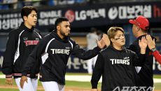 17일 잠실구장에서 열린 두산과 KIA의 경기. 승리한 KIA 선수들이 기뻐하고 있다. 잠실=박재만 기자 pjm@sportsc- 6시간전