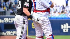 [사진]오스틴, 강민호 엉덩이 치며 인사