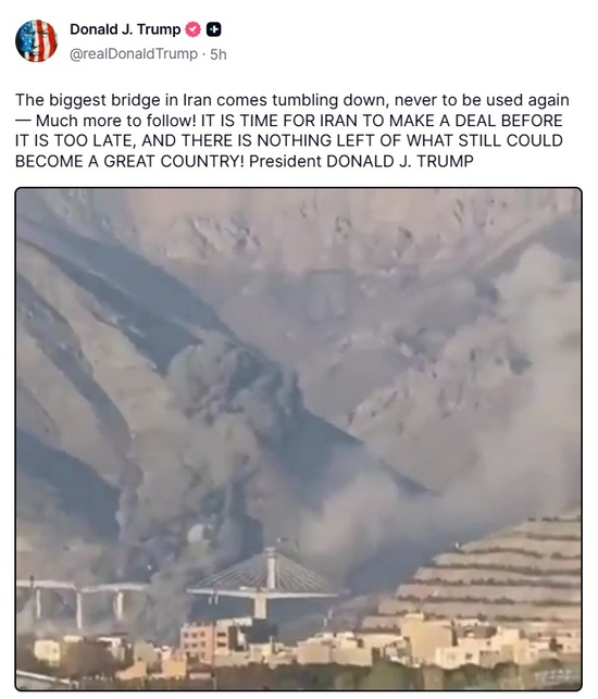 트럼프, 이란 교량 폭격 영상 공개…"늦기 전에 협상하라" 압박