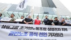 삼성전자 서초사옥 앞 초기업노조 기자회견 / 사진=연합뉴스 삼성전자에 첫 과반 노조가 공식 탄생한 가운데 노조가 내달 예고한- 2026-04-17 13:35