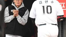 [포토] 이강철 감독 '김현수 홈런 최고다'