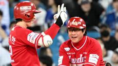21일 대구삼성라이온즈파크에서 열린 SSG와 삼성의 경기. 9회초 2사 만루 위기를 넘긴 미야지가 김재윤의 환영을 받고 있다.- 2026-04-21 21:54