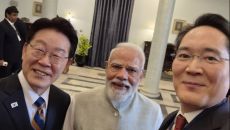 [포토]李대통령·모디 총리·이재용 회장 '화기애애 셀카' 찰칵