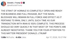 트럼프 "호르무즈 전면 개방"…이란 선박은 봉쇄 유지