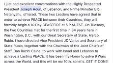 [속보] 트럼프 "이스라엘-레바논, 10일간 휴전"