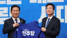 더불어민주당 정청래 대표가 17일 국회에서 열린 '1차 인재영입식'에서 전태진 변호사에게 당점퍼를 전달하고 있다. 울산 출신의- 20시간전