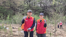 [김형호 기자] (왼쪽부터) SK에코플랜트 에어솔루션팀 김태호 프로, ESG추진팀 성나희 프로가 17일 북한산국립공원에서 식재- 24분전