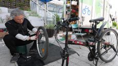 16일 서울 마포구 신수동 주민센터 앞에서 ‘찾아가는 자전거 수리 센터’ 관계자가 주민이 맡긴 자전거 바퀴를 점검하고 있다.- 2026-04-17 04:30