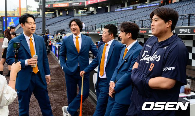14일 대전 한화생명 볼파크에서 2026 신한 SOL KBO리그 한화 이글스와 삼성 라이온즈의 경기가 열렸다. 3연패 중인 한화는 문동주, 4연승을 노리는 삼성은 최원태가 선발로 나섰다. 경기에 앞서 한화 류현진이 윤석민, 황재균, 정근우, 이택근 해설위원과 이야기를 나누고 있다. 2026.04.14/ jpnews@osen.co.kr