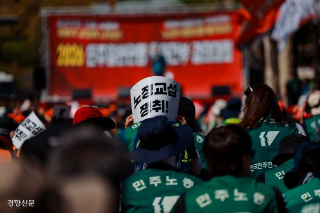 민주노총 조합원들이 16일 청와대 사랑채 앞 도로에서 정부가 원청 사용자로서 공공부문 비정규직과 노·정 교섭을 할 것을 요구하고 있다. 이준헌 기자 heon@kyunghyang.com ▶ 매일 라이브 경향티비, 재밌고 효과빠른 시사 소화제! ▶ 더보기|이 뉴스, 여기서 끝나지 않습니다 → 점선면 ©경향신문(www.khan.co.kr), 무단전재 및 재배포