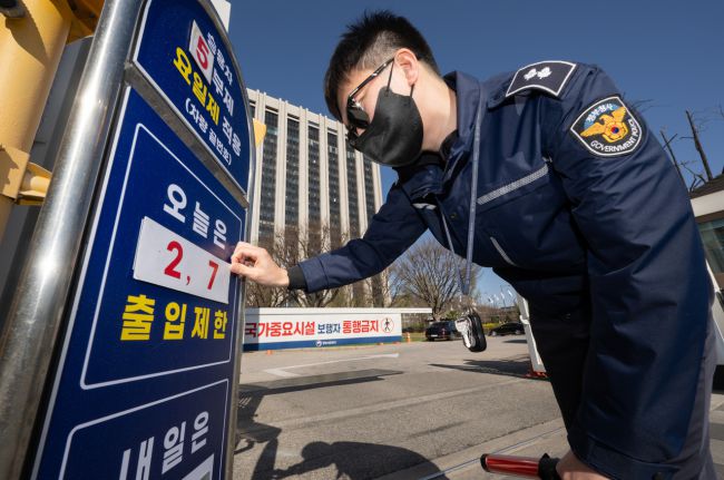 공공기관 임직원들의 승용차 이용을 홀짝제로 제한하는 공공 2부제 시행을 하루 앞둔 7일 오전 서울 종로구 정부서울청사 차량 출입구에서 관계자가 출입제한 차량 번호를 부착하고 있다. 이번 조치는 중동 전쟁 이후 원유 수급 불안에 대응해 에너지 절약을 강화하는 차원이다.