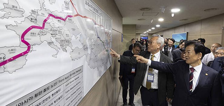 유라시아 횡단철도 지도 살펴보는 정동영 통일부 장관